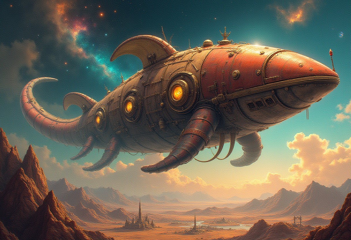 Steampunk sci-fi meets cyberpunk: A colossal bio-mechanical space squid, gleaming with brass and copper accents, hovers above a desolate alien planet. The creature's body is adorned with glowing portholes, intricate gears, and steampunk-inspired details. Vibrant, swirling nebulas and retro-style stars fill the background sky. The planet below features a landscape of sharp, geometric mountains interspersed with glowing cityscapes. Warm, golden light from the planet contrasts with cool, electric blues of space. Ray gun-era rocket fins blend with sleek, futuristic design elements on the space whale. Hyper-detailed textures combine polished metal with organic forms. Color palette mixes muted retro tones with vivid cyberpunk hues. Style evokes classic sci-fi book covers with a modern, digital art twist.