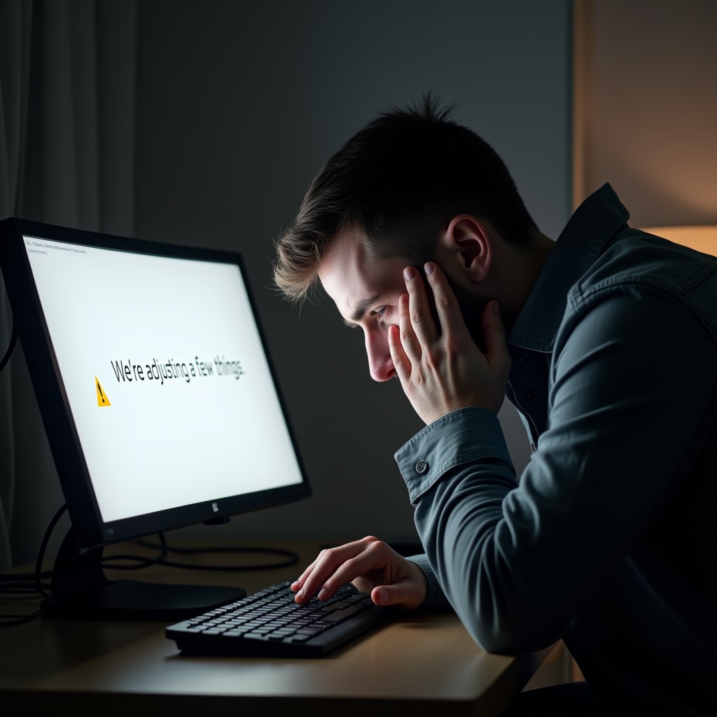 Man crying over his desk next to his PC, the PC has white screen, the error message says "We're adjusting a few things"