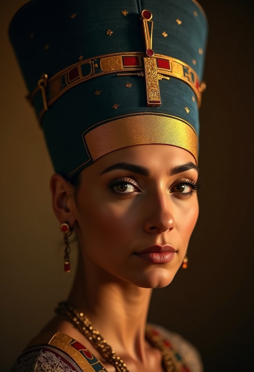 real photography , Portrait of Queen Nefertiti with her tradtional crown, beautiful Egyptian woman, with light skin ,ancient egyptian eye makeup, back light by Annie Leibovitz, f2, studio lighting, DOF, film grain, bokeh lens taken using a Canon EOS R camera with a 50mm f/1.8 lens, f/2.2 aperture, shutter speed 1/200s, ISO 100