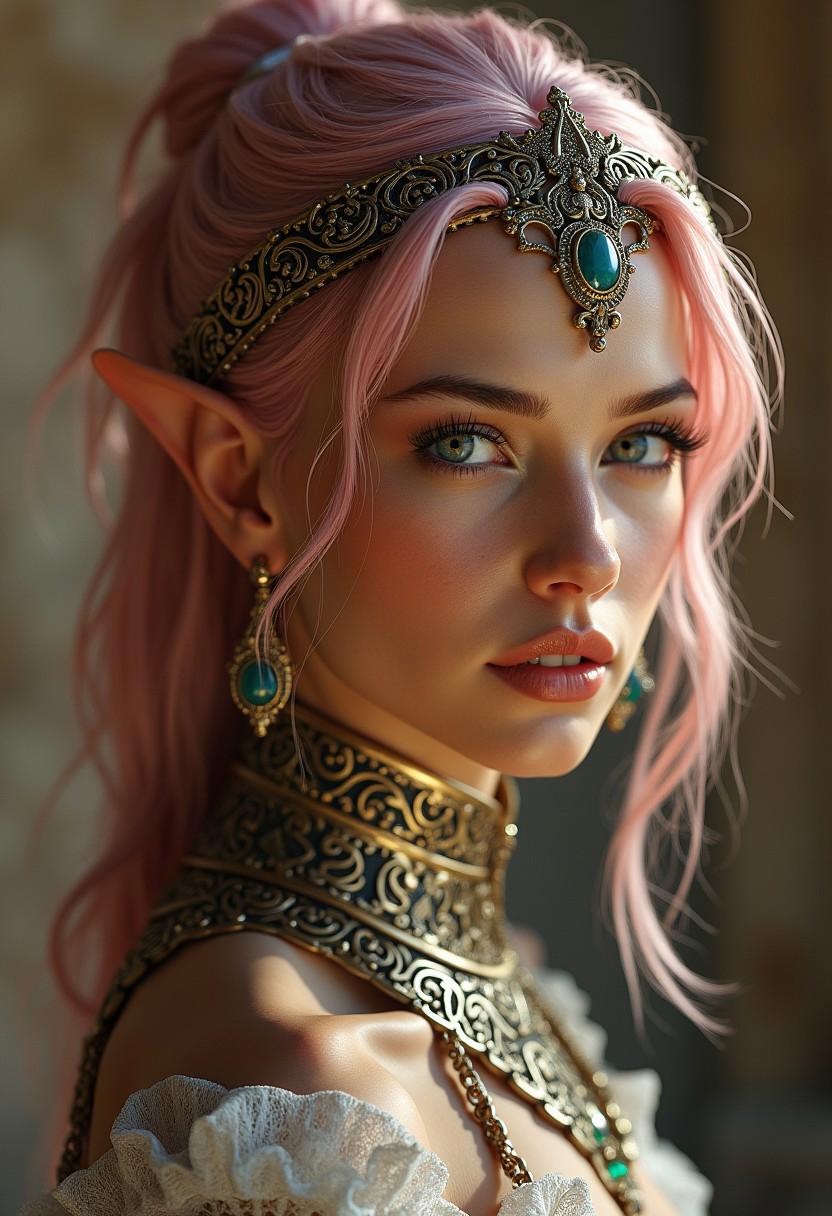 (ultra realistic,32k, ultrasharp,masterpiece:1.4),(high detailed skin:1.1),( high quality:1.1), (ultra high res:1.4), (masterpiece), (beautiful lighting:1.4), (dynamic angle:1.6), portrait, style dark white and stainless steel, gold filigree, stunningly beautiful European woman, model, perfect body, athletic, muscular, abs, 23 years old, lush pink wavy hair, elf ears, bloodstone gemstones, standing in ancient temple, extremely detailed head and face, very realistic green-blue and symmetrical eyes, (eye contact with viewer), hyper detailed, hyper quality, artstation award winner, Epic realism, meticulous masterpiece, (sturdy metal slave collar around neck), tiara, earrings,
