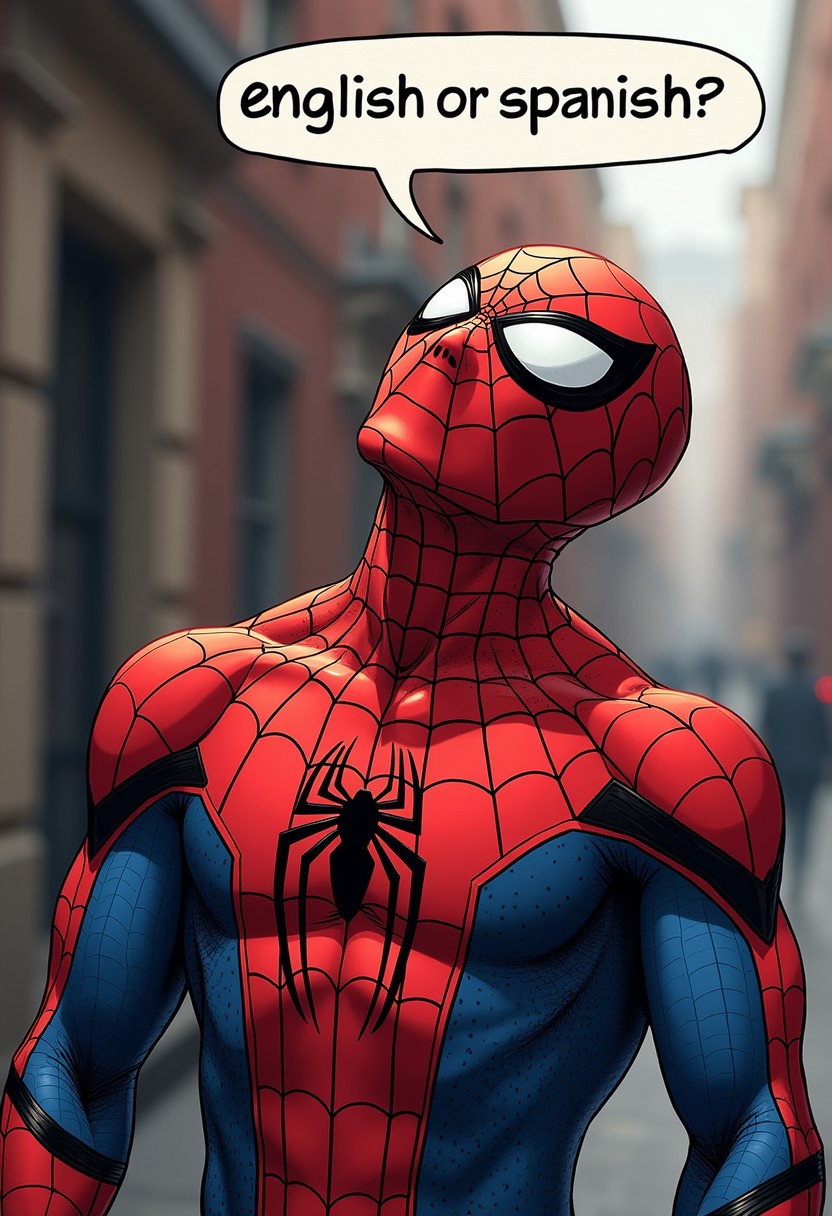 spiderman looking at the viewer and a text bubble: " english or spanish ?"