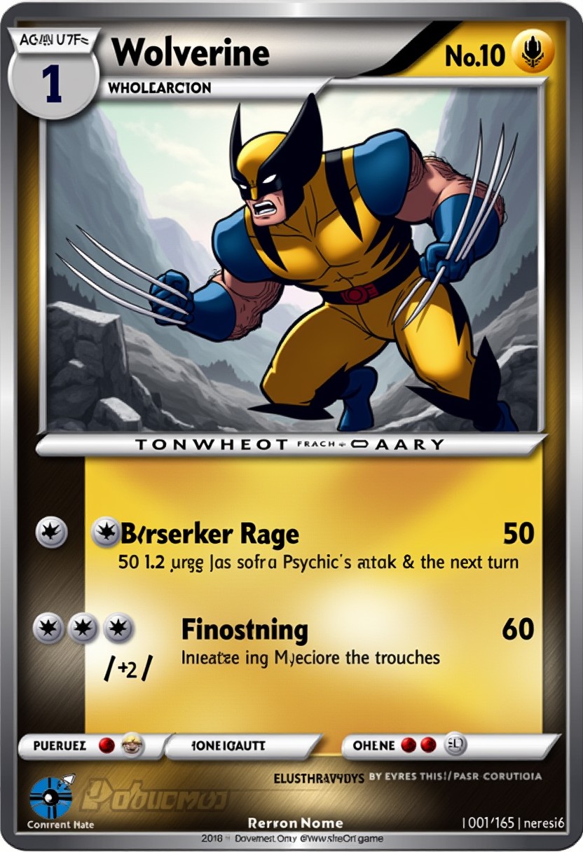 This high-quality image showcases a custom Pokemon trading card featuring Wolverine. The card is bordered in a sleek metallic gray with the name 'Wolverine' at the top left and 'HP 100' at the top right, next to a claw symbol indicating its Fighting type. The central illustration depicts Wolverine in a dynamic action pose with his iconic claws extended, set against a rugged terrain background. The card details include Wolverine's number (No. 001), alias (Logan), height (5'3"), and weight (195 lbs.). Below the illustration, the card features an attack named 'Berserker Rage,' which deals 50 damage and indicates that it "increases Wolverine's attack for the next turn." Additional card information includes a weakness to Psychic type (×2), no resistance, and a retreat cost of two energy. The illustrator's name and the card's set number (001/165) are located at the bottom, along with the Pokemon card game copyright details.