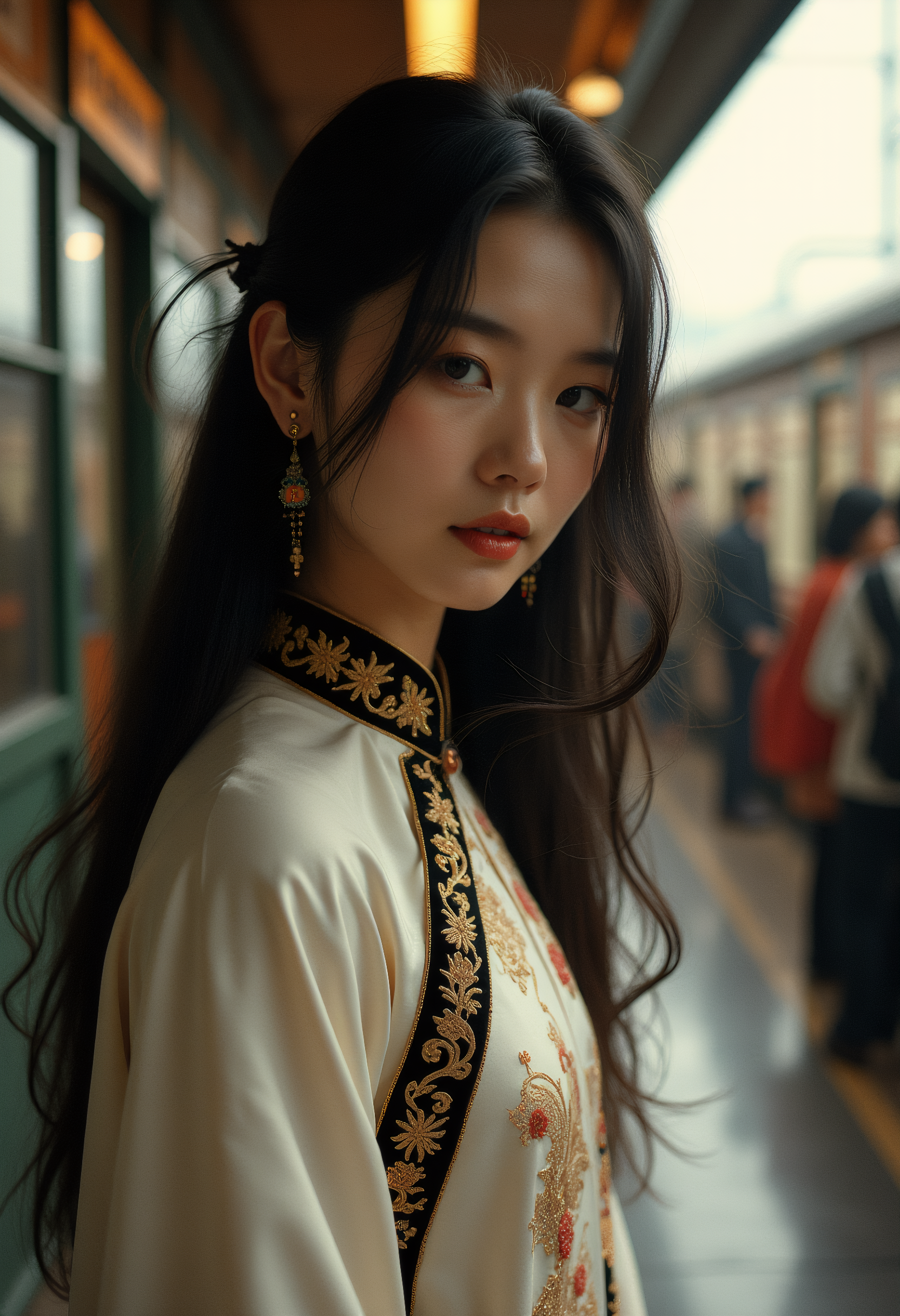 A photograph showcasing an Asian woman with long, flowing black hair, her mid-adult features partially hidden by a traditional white Cheongsam-style garment adorned with intricate golden embroidery at the neckline and dark velvet border. The garment is worn in a classic yet elegant style, evoking a sense of formality or special occasion. Her face exudes serenity and calmness, with high cheekbones and delicate features that convey composure and poise. Her eyes are cast downward, lost in introspection, suggesting contemplation and quiet reflection. The woman's olive-toned skin gives her a warm and radiant complexion. In the background, a bustling metro train station is visible through the large windows behind her, with people milling about on the platform, some rushing to catch their trains while others wait patiently for theirs to arrive. A subway train speeds by in the distance, its lights flashing as it hurtles through the tunnels. The lighting in the image is soft and ethereal, with a warm golden glow that casts long shadows across her face and clothes, creating a sense of depth and dimensionality. The light source appears to be coming from behind her, highlighting her silhouette against the vibrant colors of the train station and casting a faint shadow on the floor behind her. The overall style of the photograph is artistic and vintage-inspired, with a focus on capturing the subtleties of human emotion and expression through composition, lighting, and color. The use of film grain and subtle texture adds to the image's nostalgic feel, evoking memories of bygone eras and forgotten moments in time. As the wind blows gently through her hair, it creates a sense of movement and fluidity, as if she is about to step off into the distance, leaving behind the familiarity and routine of her daily life. The photograph captures this moment of transition, this fleeting instant when the past, present, and future converge in a single, timeless gesture. The image is a masterful blend of cultural heritage, artistic vision, and technical skill, inviting the viewer to step into its world and experience the beauty, elegance, and quiet contemplation that lies within. The composition is symmetrical, with the woman's face and body centered in the frame, while the train station and people in the background create a sense of depth and movement. The perspective is from a low angle, looking up at the woman, which adds to her dignity and stature.,(masterpiece), (best quality), (ultra-detailed), , illustration, disheveled hair, detailed eyes, perfect composition, moist skin, intricate details, earrings, by wlop, surreal painting representing strange vision of . harmonious madness, synergy with chance. unique artstyle, mindbending art, magical surrealism. best quality, high resolution,