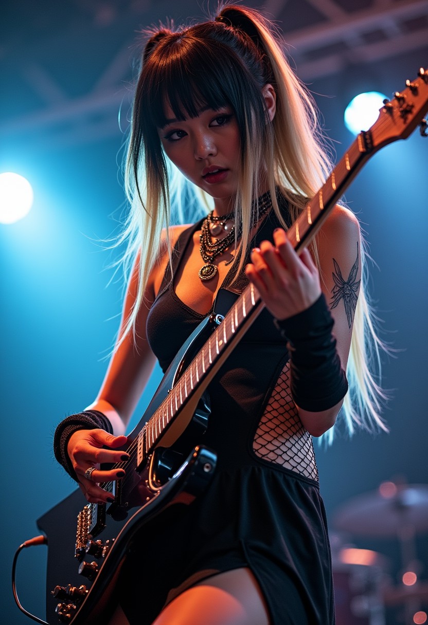 stunning, beautiful japanese heavy metal guitarist playing guitar on stage, make-up, dark eyeshadow, necklaces, hair ornament, bangs, long two-toned hair, dark with blonde highlights, sleeveless dress with clothing cutouts and slit up the side, fishnet stockings, fishnet elbow gloves, pierced navel, flying V electric guitar, holding instrument, playing electric guitar, stage lights, bokeh, dynamic lighting and shadows, masterpiece, dynamic angle, solo focus, live, photorealistic, High Detail, Perfect Composition