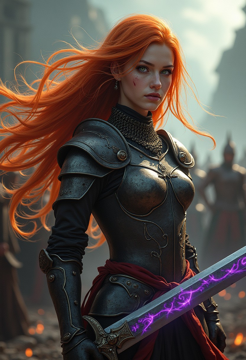 Masterpiece, dark fantasy, 3/4 shot, beautiful young woman, long flowing ginger hair blowing in the wind, determined green eyes, scar across face, wearing a intricate breastplate and chainmail, wielding a magical sword with flaming purple runes, standing on a battlefield, dynamic lighting, bold colors