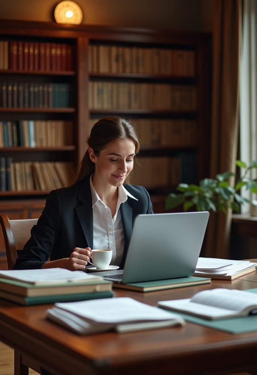 In a quiet, elegant library, a professional woman sits at a large wooden table with a cup of espresso. Surrounding her are stacks of reference books and papers, and her laptop is open with several tabs visible on the screen. The ambiance is serene, with the subtle sound of pages turning and a clock ticking in the background. She takes a moment to sip her coffee, deeply immersed in her research and thoughts.