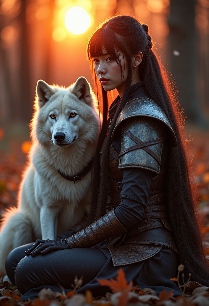 photorealistic image of stunning, beautiful japanese barbarian warrior, long hair with bangs, leather and fur-trimmed armour, sitting contentedly with a white wolf in an autumn woodland clearing at sunset, face in sharp focus, detailed face, detailed eyes, perfect hands, High Detail, Perfect Composition, dramatic lighting, high contrast, motion blur of the background, neon lights, bokeh, viewed from behind and to the side