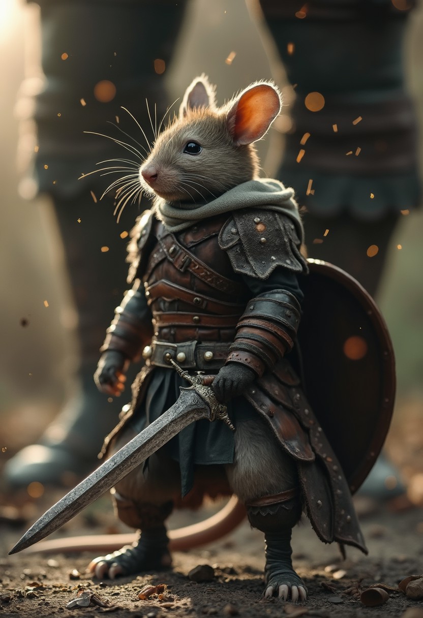 a mouse warrior in leather armor, with sword and shield in fighting stance in front of massive human legs, dream-like, fantasy, cinematic, bokeh