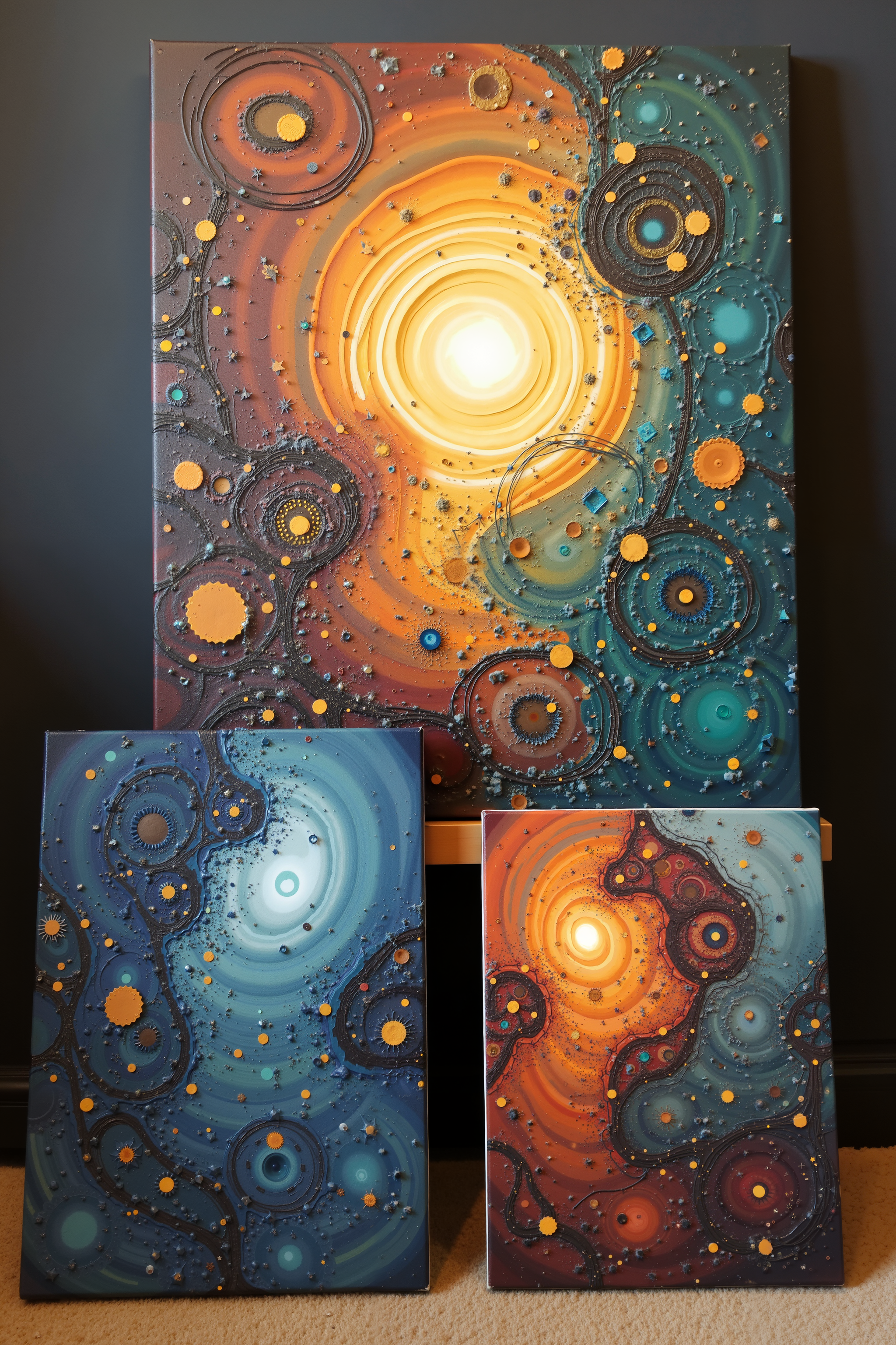 A group of abstract art pieces, each with intricate patterns and shapes that seem to come alive, stand in front of a canvas. The first piece is composed of geometric forms and swirls of energy, creating an otherworldly atmosphere. In the middle of the frame,