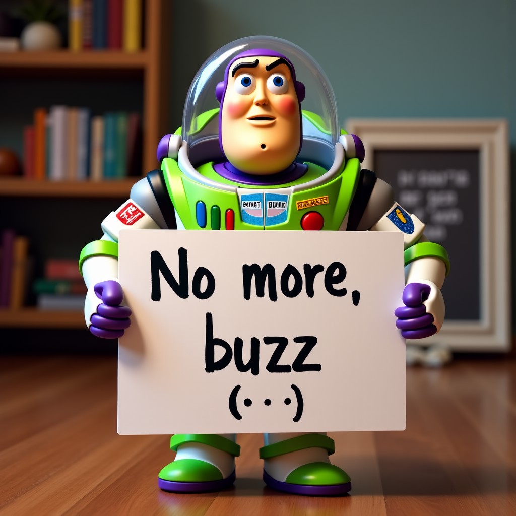 Buzz lightyear from toy story, sad face, ((holding a large poster with the words "no more buzz :'("))