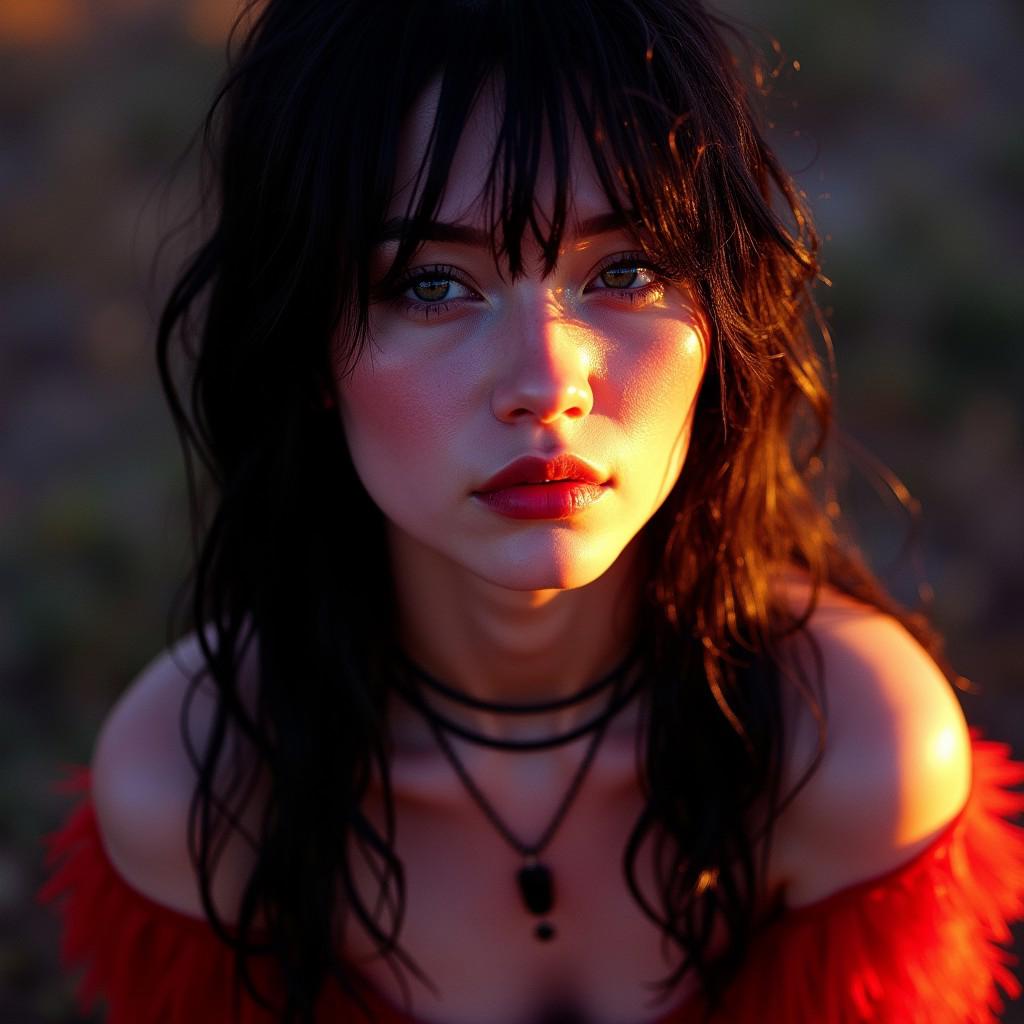 shot on fuji film, golden hour, emo sorceress girl portrait face with hot mage clothes and black hair, purple rim light, strong cast shadow, universe, strong contrast, photorealistic, shiny, texture shot
