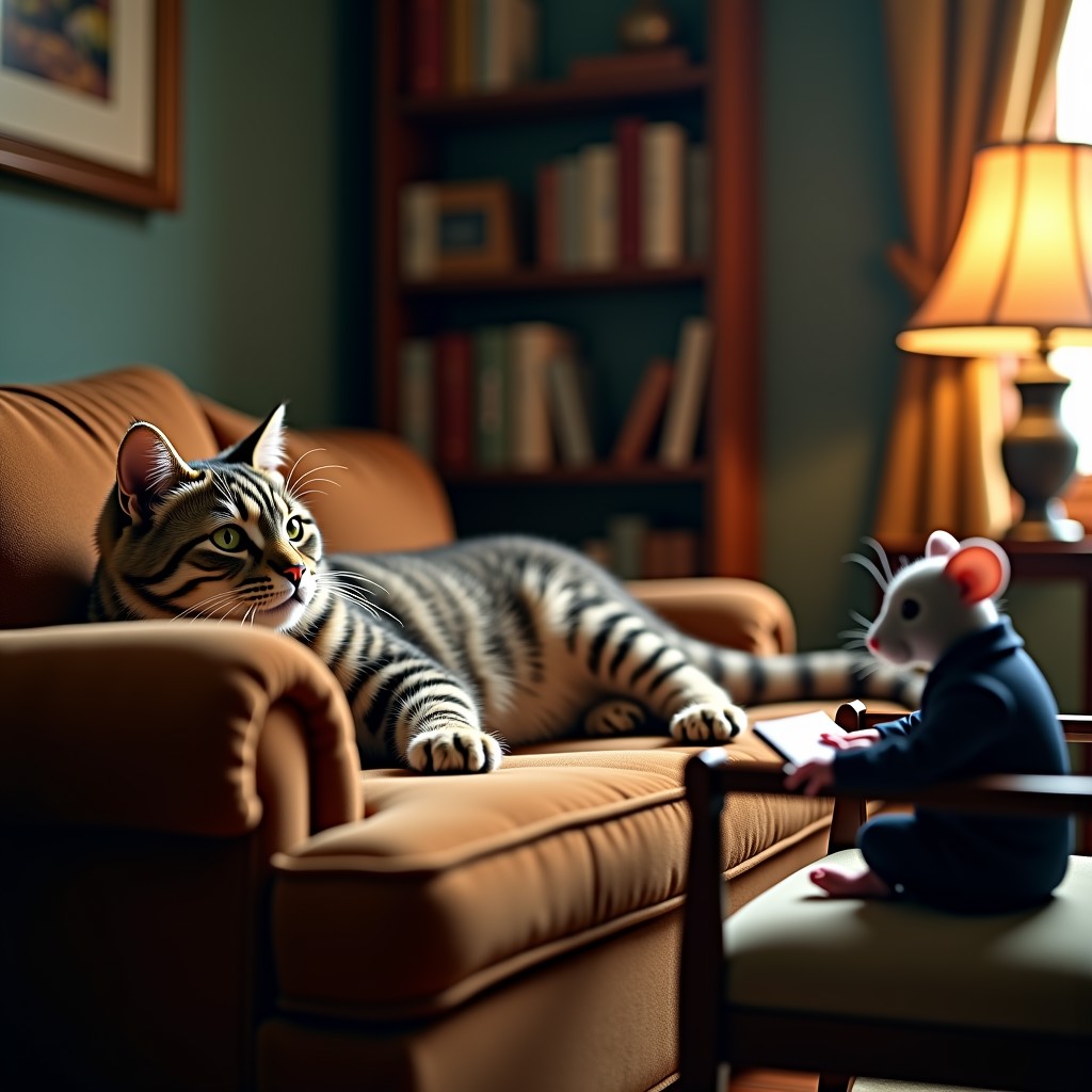 Imagine a hyper-realistic scene in a cozy, softly lit therapist's office. A life-sized cat is lying on a plush, vintage sofa, fully stretched out in a typical therapy pose. The cat’s head is resting on one arm of the sofa, turned to the side, while its body extends across the sofa with its paws reaching toward the other end. The cat’s face is filled with worry, deep in thought as it stares off into the distance. Across from the sofa, but not directly facing the cat, a life-sized mouse sits in a small, comfortable armchair. The mouse is dressed in a tiny, professional suit, holding a notepad and pen. It’s turned slightly away from the cat, absorbed in taking notes with a calm and focused expression. The two are positioned in a way that suggests the mouse is listening intently to the cat’s concerns without needing to make direct eye contact. The room is warmly decorated with soft lighting, bookshelves, and framed pictures, creating an atmosphere of quiet introspection. The scene captures a realistic, empathetic moment where the cat, lost in its thoughts, is supported by the attentive presence of its mouse therapist, even though they aren’t directly facing each other.