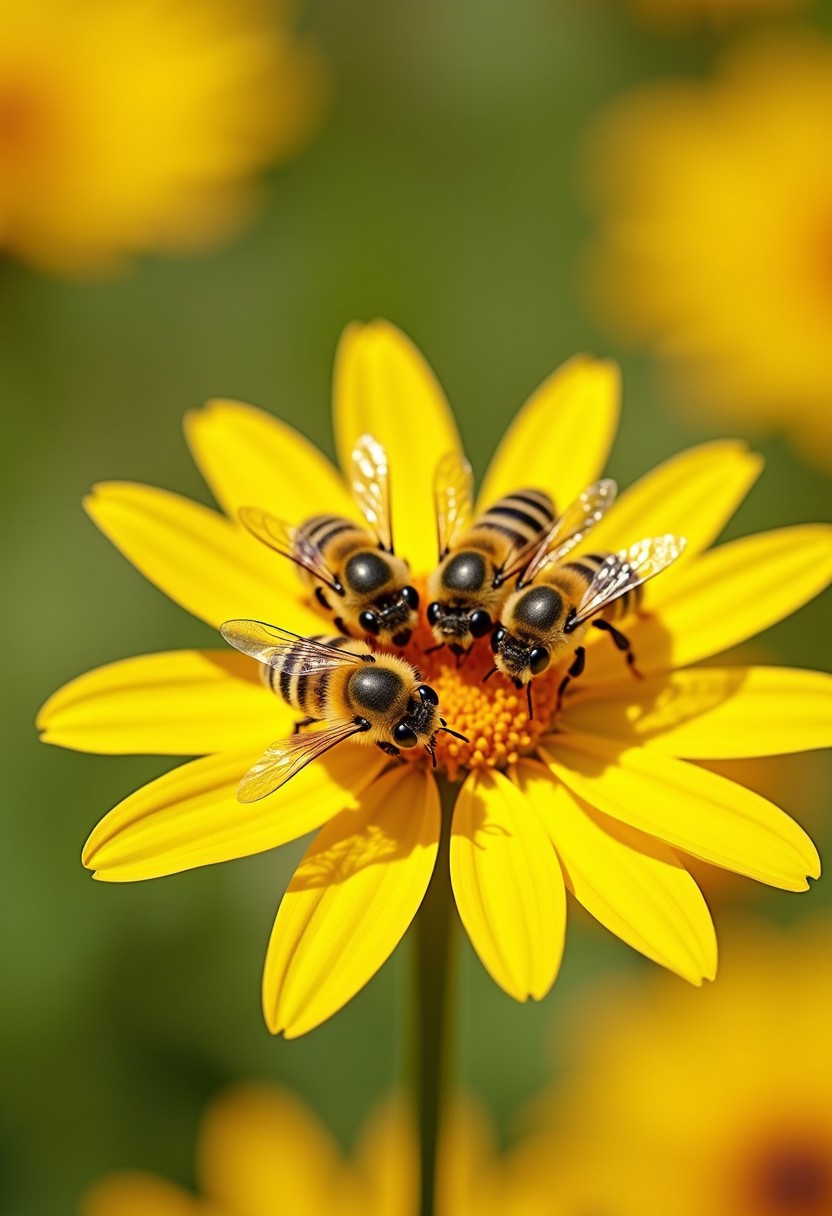 On a (bright yellow flower), a group of bees is busily collecting nectar. The bees' wings shimmer in the sunlight, appearing (transparent and delicate). The vibrant color of the petals contrasts harmoniously with the bees' (orange-black stripes), while the background is a blur of (soft greens and yellows), adding a tranquil natural beauty to the scene. The bees are focused on the nectar within the flower, showcasing the ceaseless labor and harmony found in nature.