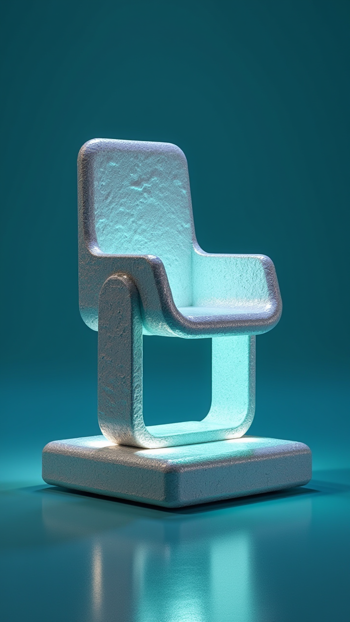 A 3D-rendered sculpture of the [Chair lift] logo, crafted from titanium, illuminated by LED lights, Abstract texture, set against a Ground Aquamarine background