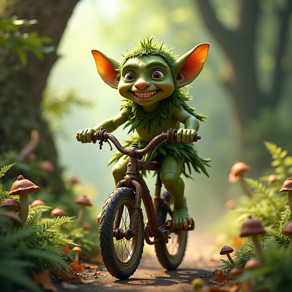 Create a hyper-realistic photograph of a small goblin having the time of his life, riding a bicycle crafted entirely from the forest’s natural materials. The goblin, with mossy green skin and pointed ears, has a wide, toothy grin as he pedals through a sun-dappled forest path. His bicycle is a whimsical creation: the frame made of twisted, sturdy branches; the wheels are large, woven leaves, and the handlebars are adorned with colorful mushrooms and tiny flowers. The goblin’s feet barely reach the pedals, which are fashioned from acorn caps, yet he rides with ease and enthusiasm. His leafy tunic flutters in the breeze as he weaves through towering trees and jumps over roots. The forest around him is alive with vibrant greenery, soft ferns, and dappled sunlight filtering through the canopy. A few woodland creatures, like squirrels and birds, watch in curious delight as the goblin zooms past, kicking up a spray of fallen leaves. The scene is one of pure joy and adventure, capturing the goblin’s playful spirit as he enjoys his handcrafted bicycle in his forest home