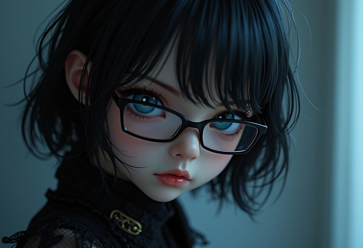raw lighting, overexposed, harsh flash,,score_9, score_8_up, score_7_up, score_6_up,masterpiece, ultra-realistic 8k, (best quality), highly detail, sharp, detailed,higher resolution textures, 4k graphic resolution, 1girl, solo,beautiful girl, perfect eyes, sexy, cute face,pose,seductive pose, goth girl,blue eyes,oily skin,shiny skin, black glasses, black hair hime cut,glasses,looking downwards,gigantic breasts, Heavy Breasts,delicate body, music stage, hosting live music, laying on stomach performances,Expressiveh , text that says "MommyMia"