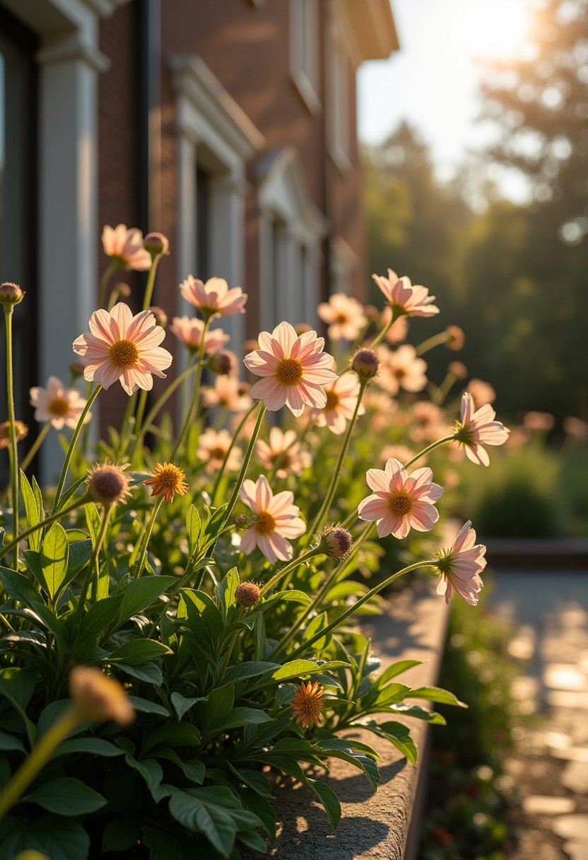 variegated flowers on the back terrace of a country mansion, basking in the warmth of late afternoon spring sunlight