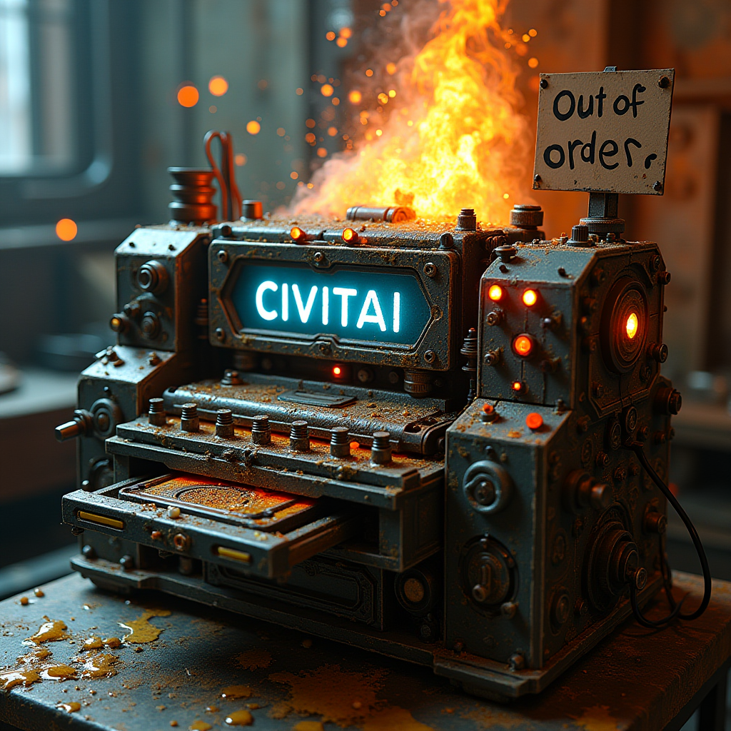 photo of a complex cyberpunk futuristic printer exploding with oil with lots of gears and knobs and buttons and lights with CIVITAI written on it, a (handwritten sign that says out of order:1.65)