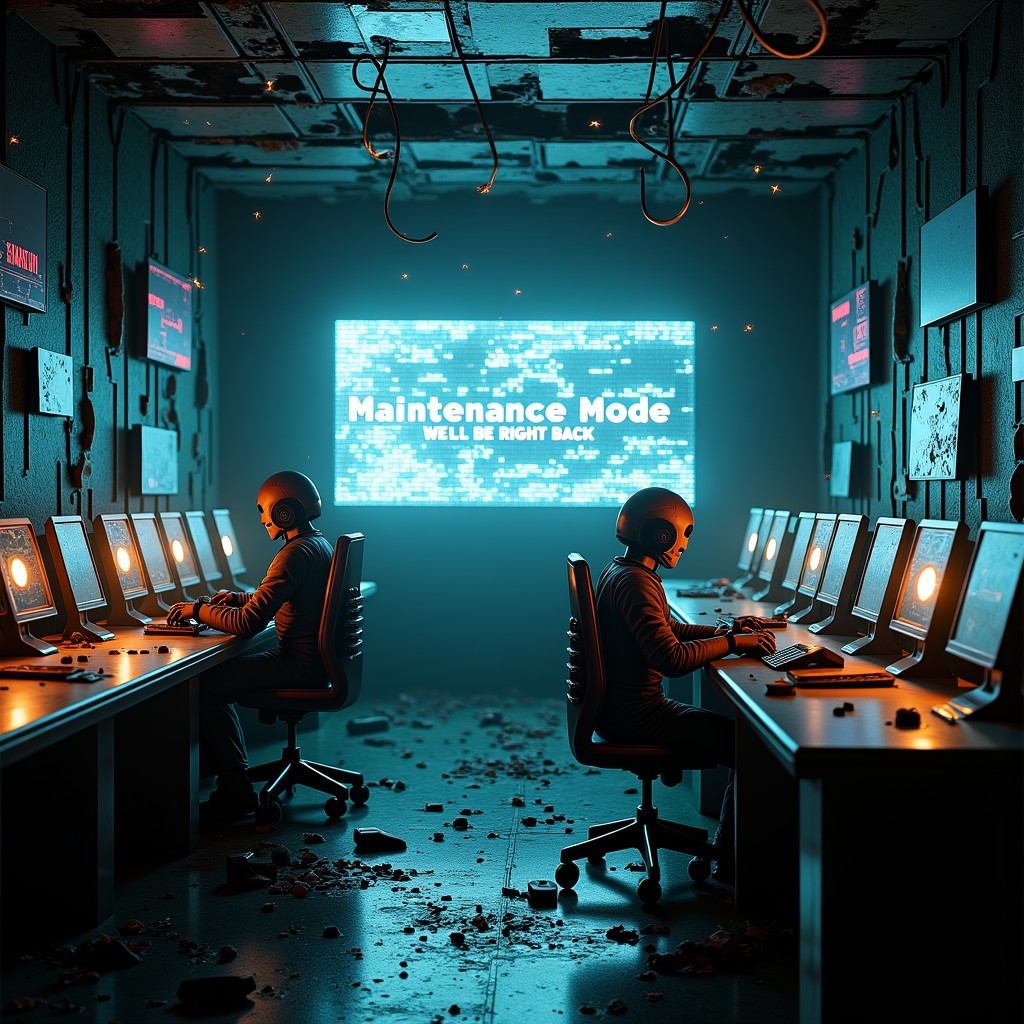 A highly detailed, dystopian futuristic control room in ruins. The environment features cracked screens displaying error messages and static, with loose, sparking wires hanging from broken consoles. The room is dimly lit, with flickering lights casting dramatic shadows. Robotic or AI figures, in a state of panic, are attempting to repair the chaos, their movements glitching. The scene includes subtle, glitching text overlays like 'System Failure' and 'Maintenance Mode Activated.' In clear view, the text 'Maintenance Mode: We'll Be Right Back' is prominently displayed in the center of the image, integrated seamlessly with the chaotic environment. The overall atmosphere is dark, chaotic, and filled with a sense of urgency, using realistic textures and cinematic lighting to enhance the immersive feel.