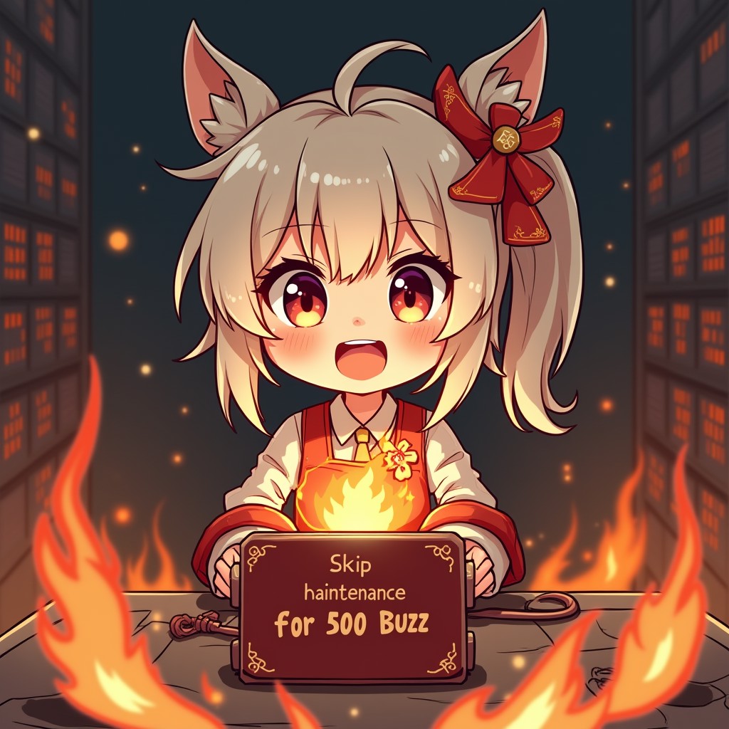 squire button with inscription text "Skip maintenance for 500 Buzz". burning computer. Cute girl Ganyu from genshin impact. Servers