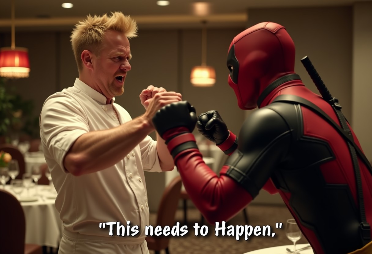 A photorealistic scene inside of a fancy restaurant. The scene features an angry Gordon Ramsay wearing a chefs outfit without gloves and raising his hands in fists. The fighter fighting him is Deadpool with his fists raised. At the bottom of the image is a closed captioning text in white font reading "This needs to happen" masterpiece, 8k,