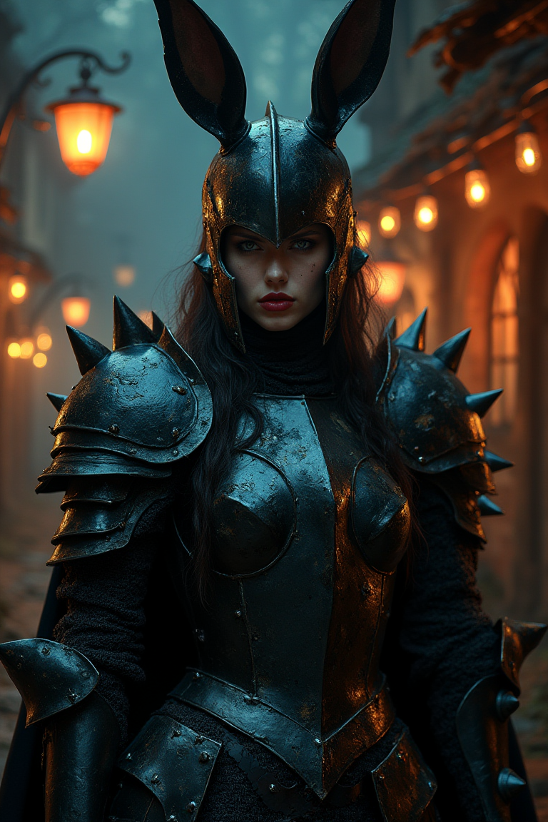 a pinup of a fearsome but beautiful female black knight wearing sexy worn and scratched and patched black armor with spikes and bunny ears, full sultry lips, she is guarding the entrance of a tavern at night, colorful bright vivid colors, low angle shot <lora:flux_realism_lora:1>