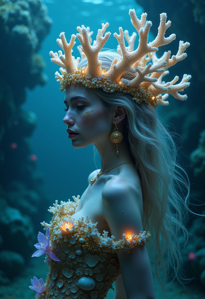 An oceanic oracle rises from the depths of the sea, her form both fluid and ethereal. Her head is adorned with an abstract crown made of coral, intricately shaped and glowing with bioluminescent blues and purples. The coral crown is intertwined with delicate gold ornamentals, shimmering like treasure found in the deep ocean. Her hair flows like water, blending seamlessly into the surrounding waves, and her skin has a soft, iridescent sheen. She wears a gown made of seaweed and shells, with gold accents woven throughout, and delicate sea flowers bloom along her arms, glowing softly in the dim light of the ocean. The scene is mysterious and enchanting, capturing the deep, ancient wisdom of the sea, similar to the underwater fantasy art of Tomasz Alen Kopera.