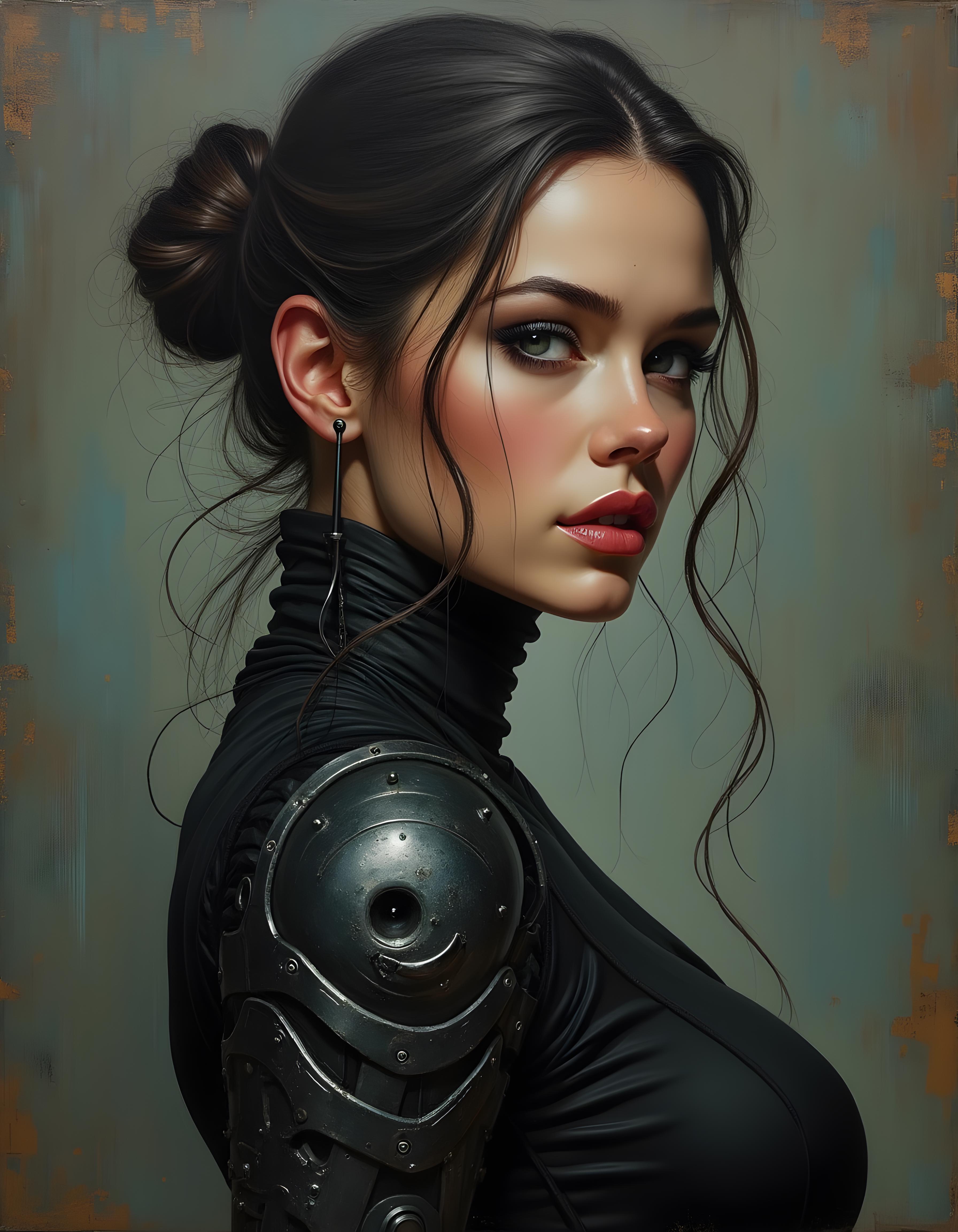 w4rh4mm3r style oil painting, grimdark, portrait of a beautiful woman with cybernetic arm