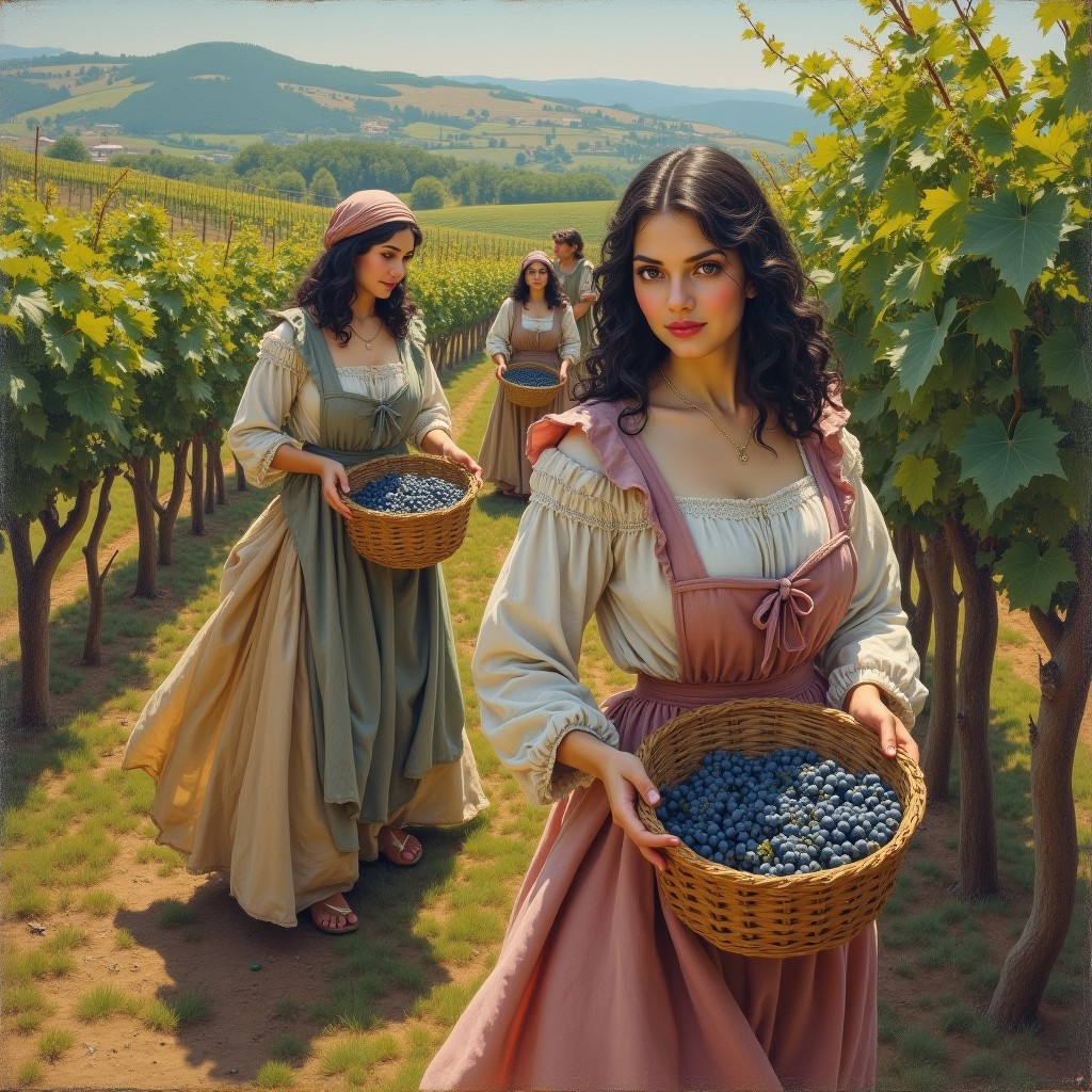 Renaissance, Italy 16th century, women harvesting grapes in vineyards, in the foreground a beautiful young woman with a basket of grapes in her hands, black wavy hair, aprons, Simple peasant dresses, headscarves, large baskets of grapes, Beautiful weather, hot day, oil painting, pastel drawing, paint texture, high detailing,