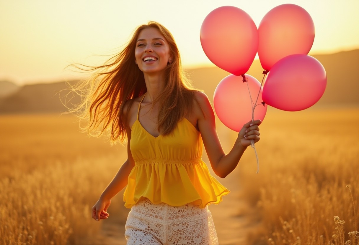 A stunning blonde California model in a yellow sleeveless top side boob and white crochet lace pants runs, long brown hair through, a sunlit California field, her long brown hair, holding a large bunch of pink balloons in her right hand, capturing a playful golden hour glow.