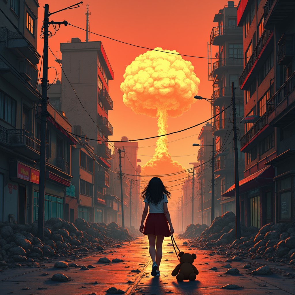 Bold text saying (((something went wrong!))) Bold text, Apocalyptic city, cyber city, nuclear bomb in the background, girl walking facing away, girl dragging a teddy bear on the pavement