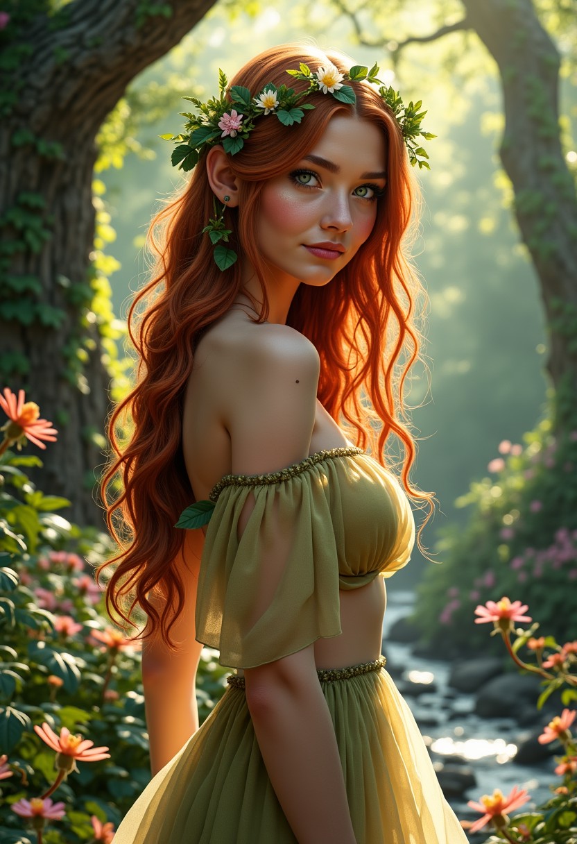 A high-resolution, photorealistic image of a mystical forest nymph standing gracefully in a sun-dappled clearing. She has long, wavy auburn hair intertwined with flowers and vines, cascading over her bare shoulders. Her eyes are a captivating emerald green, and her skin has a soft, earthy glow with delicate leaf patterns. She wears a sheer, flowing dress made of gossamer fabric that blends with the surrounding foliage, revealing her curvy, ethereal figure. The background features towering ancient trees, vibrant wildflowers, and a sparkling brook, creating an enchanting, serene atmosphere. The composition follows the golden ratio, with a depth effect that adds a sense of realism and dimension. The focus is on the nymph's seductive, inviting smile and her natural, otherworldly beauty.