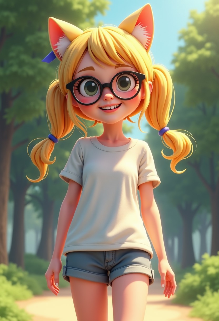Disney style, 3d, Illustrated and detailed, cgi. A cartoon girl with pigtails, blonde hair, missing teeth, glasses, white shirt, shorts, cat ears, outdoors, park, portrait.