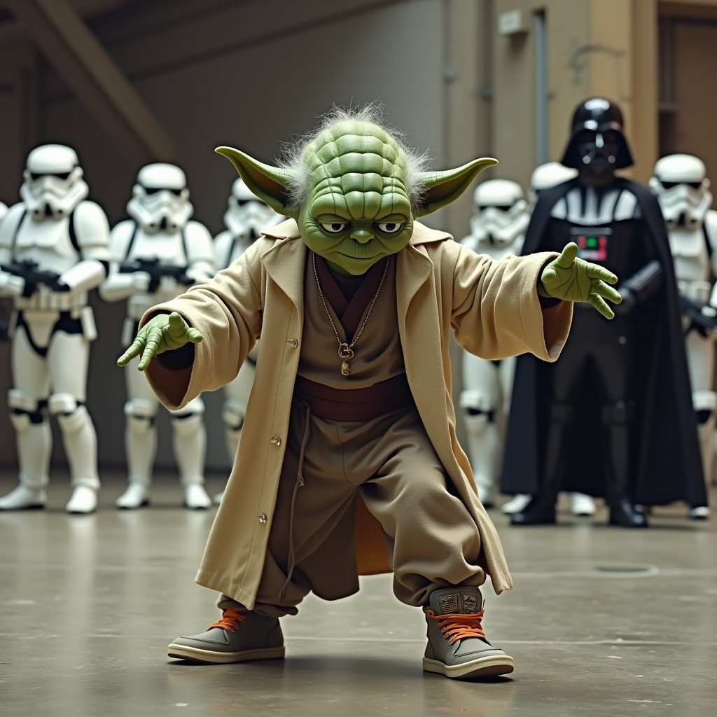 Yoda breakdancing, he's in the hangar bay in front of a row of Storm Troopers, Darth Vader dancing in the background, Yoda is busting out some fresh dance moves and doing the most difficult of breakdancing routines, he's also got them dope sneakers on, impressive, most impressive