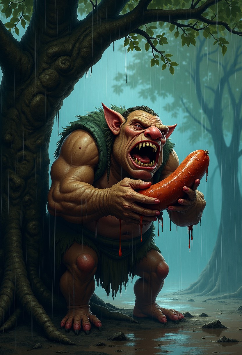 The Ogre Moron, caught in the midst of a rainstorm, seeks shelter under a large tree. His moldy sausage, held tightly as if a talisman, is his only concern as he tries to shield it from the rain. His expression, a mix of confusion and determination, highlights his singular focus on protecting his snack., in the style of the decaying empire of Würstreich, dark magic and grotesque creatures abound, inspired by Sean Aaberg's punk aesthetic, dark fantasy world combines grim landscapes with vibrant, exaggerated colorful art, heroes skirmish monstrous foes in a setting where rebellion, decay, and mysticism intertwine, crafting a unique, immersive vibe