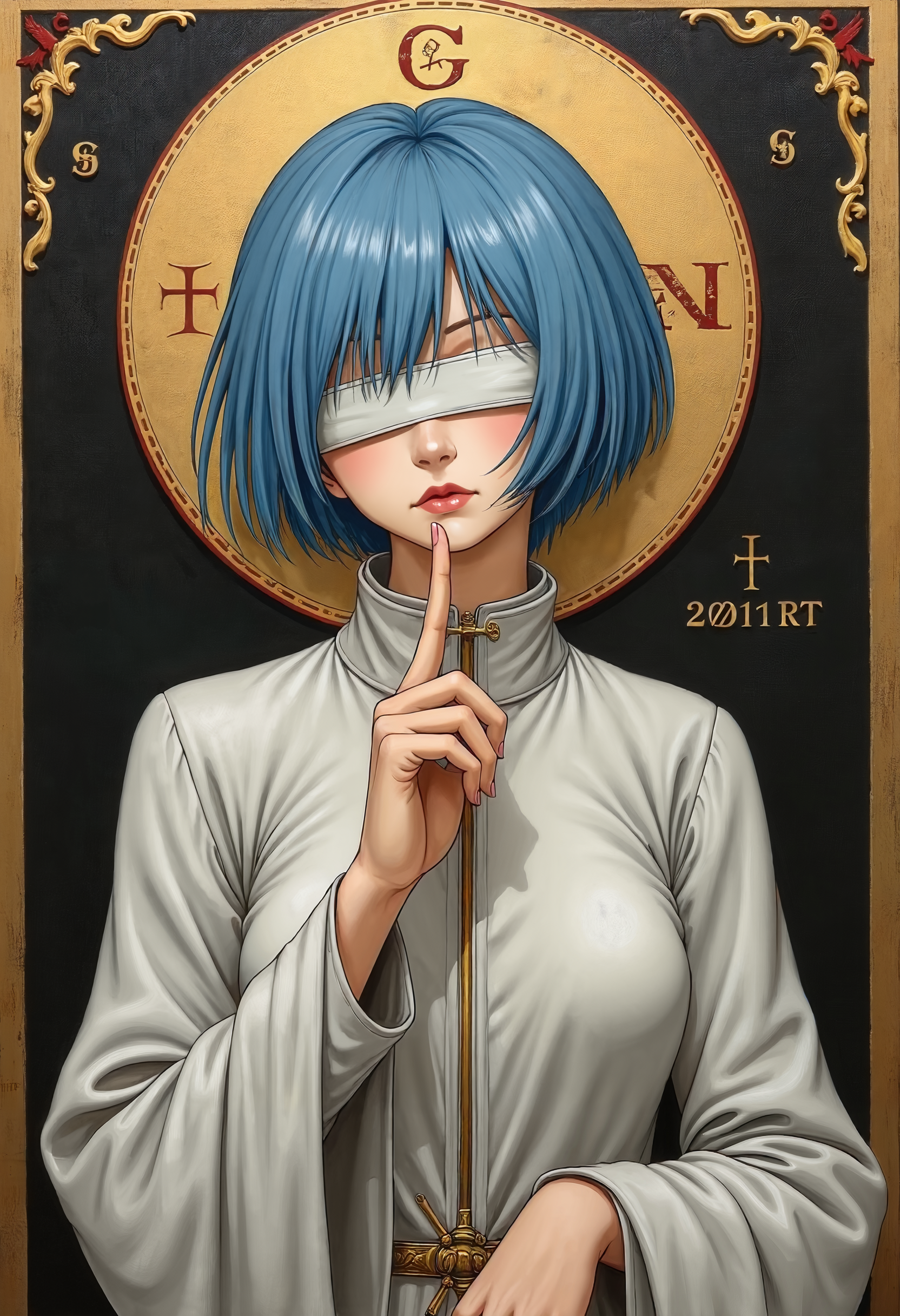orthodox painting, blue short hair, Rei Ayanami from Neon genesis evangelion, wearing white latex jumpsuit, saint,sacred painting,showing one finger, beauty detailed face, blindfolded, relief expression, painting by Simone Martini and gustav klimt,gothic art, sienese school,