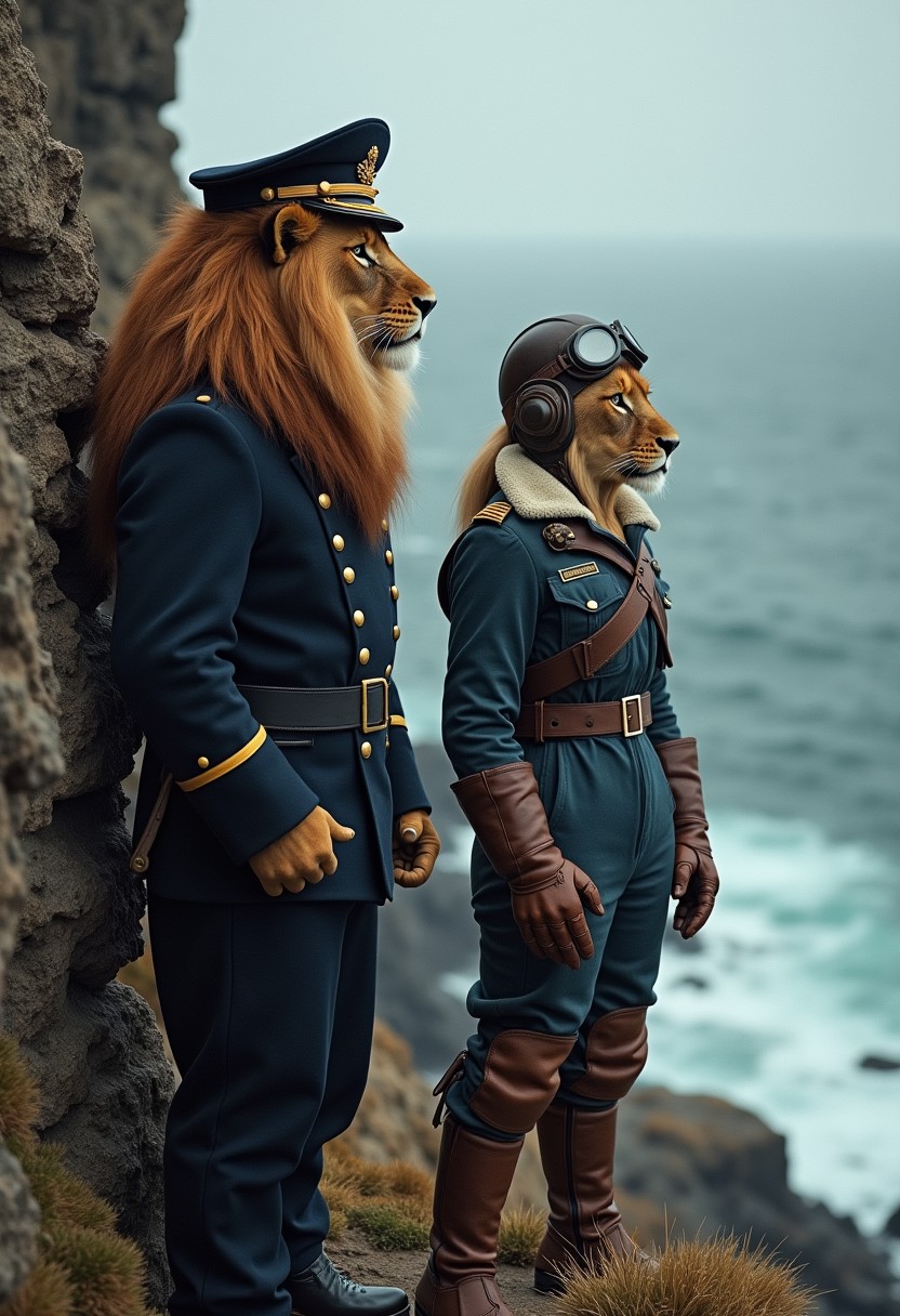 two anthropomorphic lions, a male and female, a philosophical male lion Royal Navy captain's unform and peaked cap looks out from a cliffside at a stormy british sea, isambard brunel, strong, courageous, confident, bold, a female lioness wearing royal navy overalls and leather gauntlets with a flying helmet and goggles,