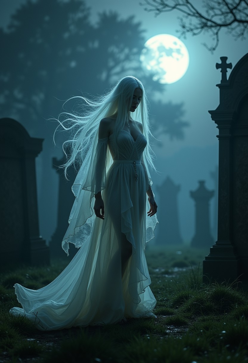 A seductive banshee drifting through an ancient, mist-covered graveyard at midnight. Her long, ghostly white hair flows like a veil, and her pale, translucent skin glows faintly in the darkness. She wears a tattered, ethereal gown that clings to her figure, fluttering in the breeze. The atmosphere is eerie and hauntingly beautiful, with the full moon casting a ghostly light over the tombstones as she lets out a soft, melodic wail that both entices and terrifies.