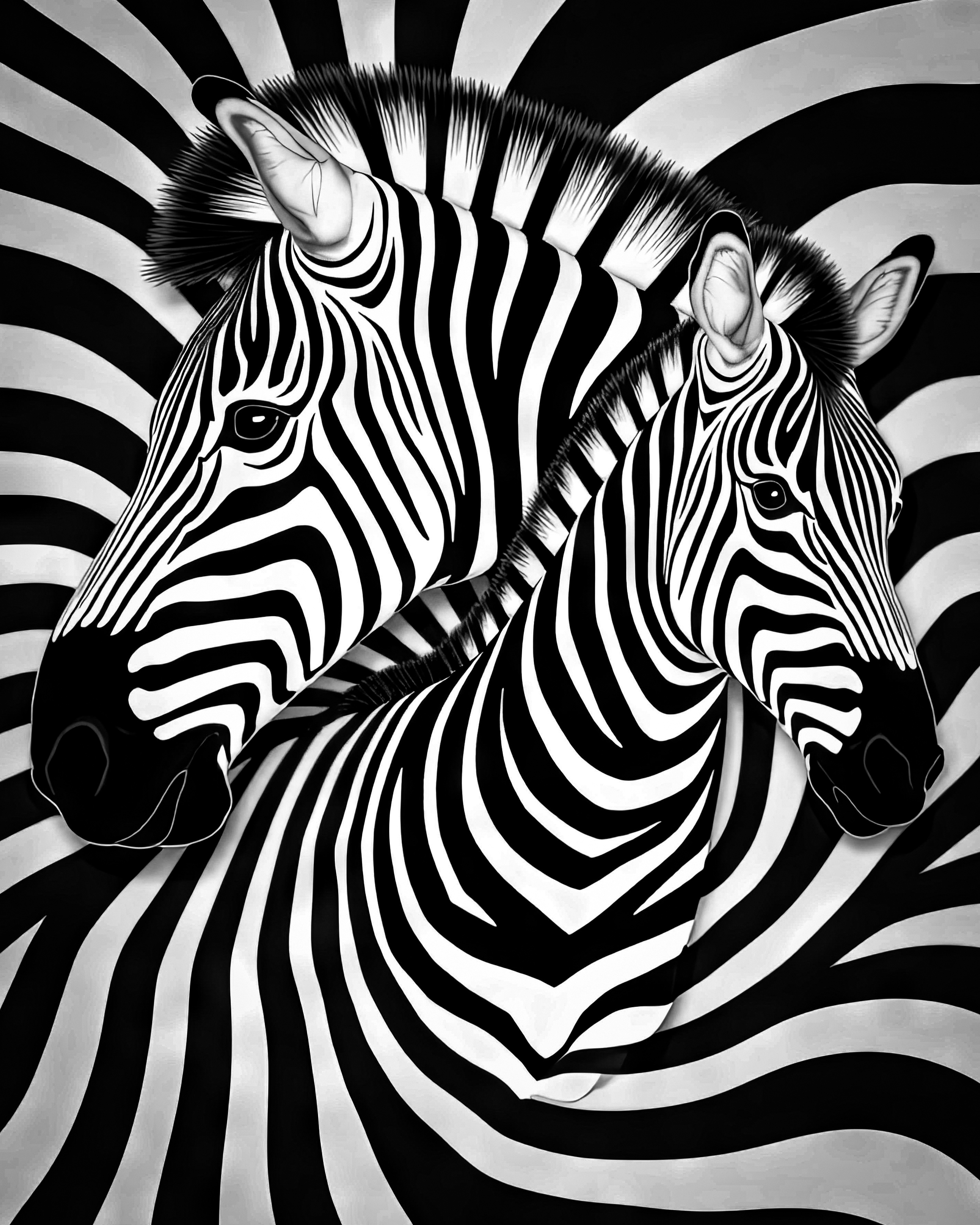 This merge artistic photo presents a fascinating optical illusion: a fusion camouflage of zebras on a background with alternating black and white horizontal stripes.