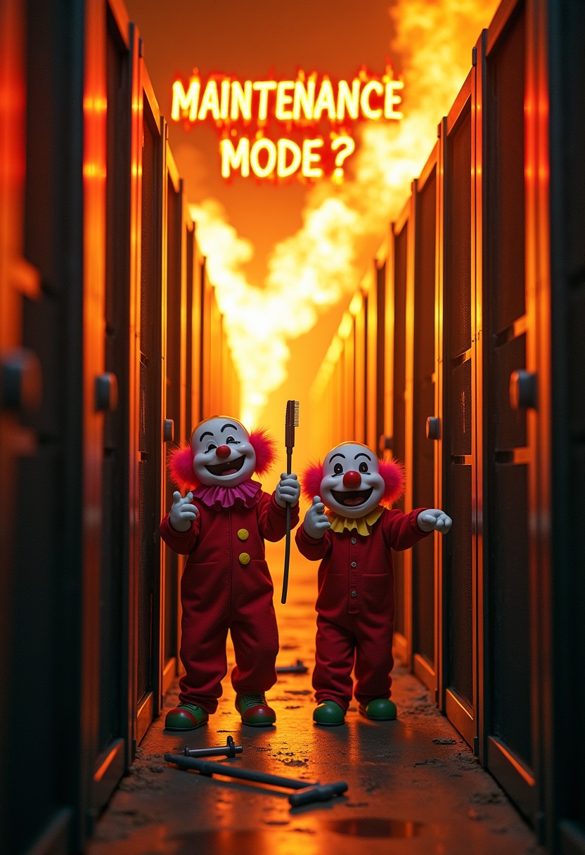 photograph of a bumbling group of little people clowns holding random tools that are laughing hysterically while trying to fix a burning and exploding server room. at the top of the image it says "Maintenance Mode?" in fiery letters.