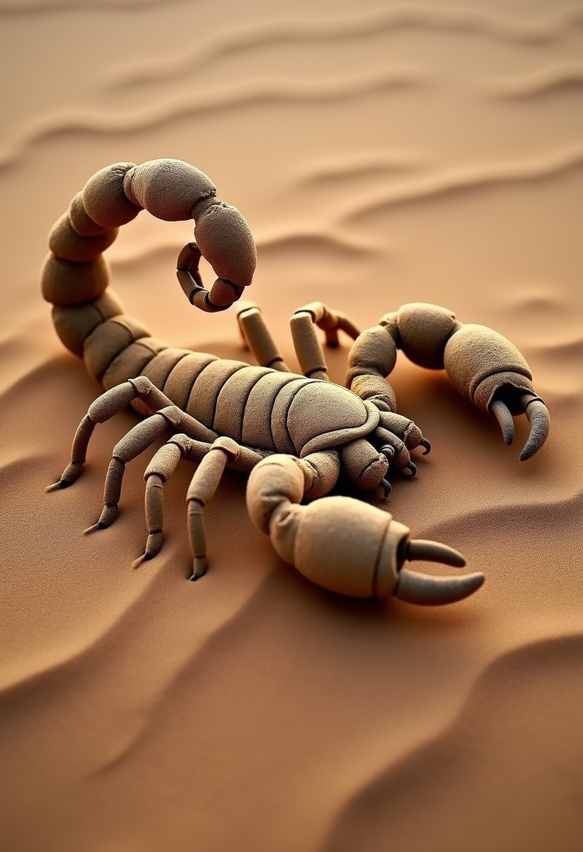 A full shot of a (scorpion made of swirling sand:1.3), scorpion shape, fine grains, shifting dunes, dissolving, mist, warped, deformed, gritty, ultra detailed, photo, Canon M50, 200mm, desert background