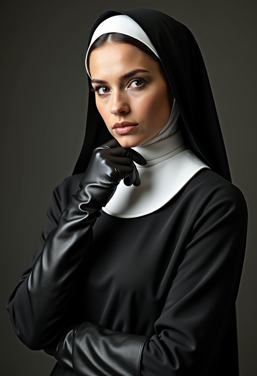 modern portrait of nun with tight thin high leather gloves Which tightly grasp her hands and fingers, the image up to the waist, you can see the elbows covered with gloves and the folds of the dress in the style of Gottfried Helnwein and in the style of Alberto Vargas and in the style of David LaChapelle, long eyelashes, high detalization