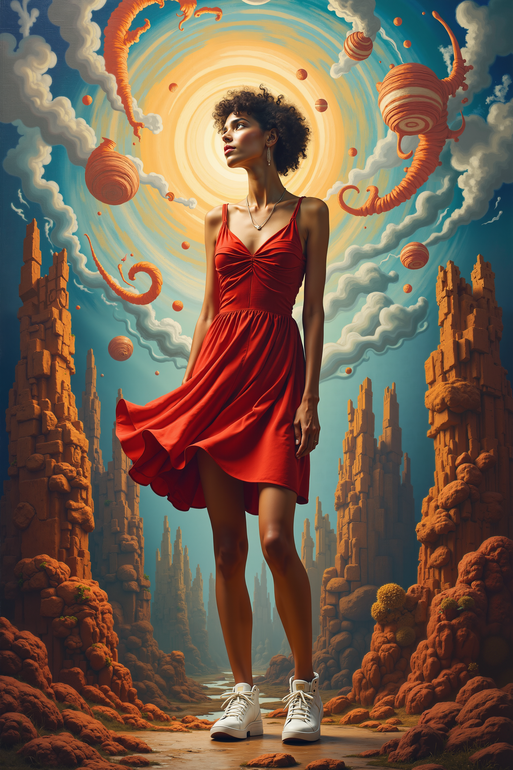 a surreal landscape filled with swirling shapes and patterns fills the canvas. In the center of the scene, a figure dressed in an abstract outfit stands tall, wearing a red dress and white sneakers. Her movements are fluid and graceful,