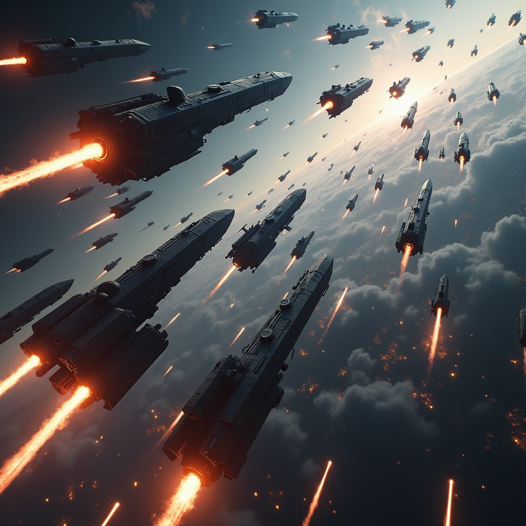 A science fiction space battle several large ships and many smaller ships engaged in combat over a planet, lasers, missiles, explosions, dynamic, dramatic, action, sci-fi, science fiction movie still