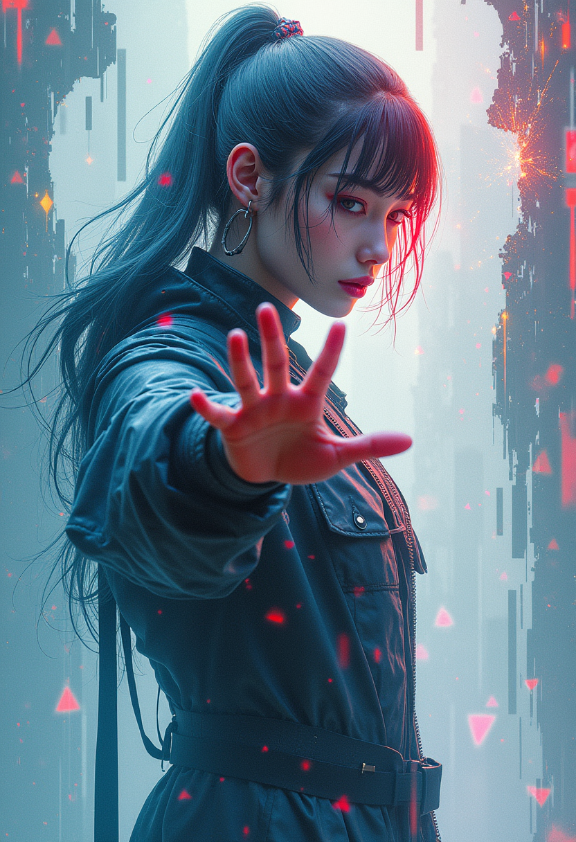 masterpiece, professional artwork, intricate details, realistic, inspired by Guweiz and Michael Divine, glitch, double exposure, fantasy theme, hologram, large cracks in reality, breaking through glass, shattered reality, Cinematic, cyberpunk, fourth wall break, watercolor, full body, foreshortening, reaching towards viewer, hand towards viewer, palm out, pale realistic skin, neon cybernetic tech fashion, contrasting colors, cascading matrix background