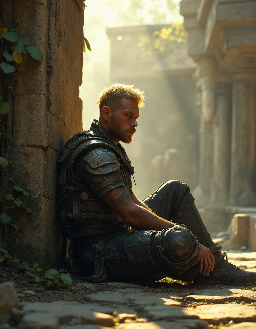Photorealistic, a young blond man, buzzcut messy hair and rugged beard, with healthy blush and subtle freckles, A warrior sits on the ground in an old, overgrown courtyard, leaning against a crumbling stone wall. His once-advanced armor is now faded and chipped, with wires exposed and gadgets no longer functional. The environment is an ancient alien temple, long abandoned, with vines and moss creeping over cracked stone pillars, and weathered statues eroded by time. The air is thick with the sense of history, as the sun sets, casting long shadows and a golden hue over the ancient ruins.