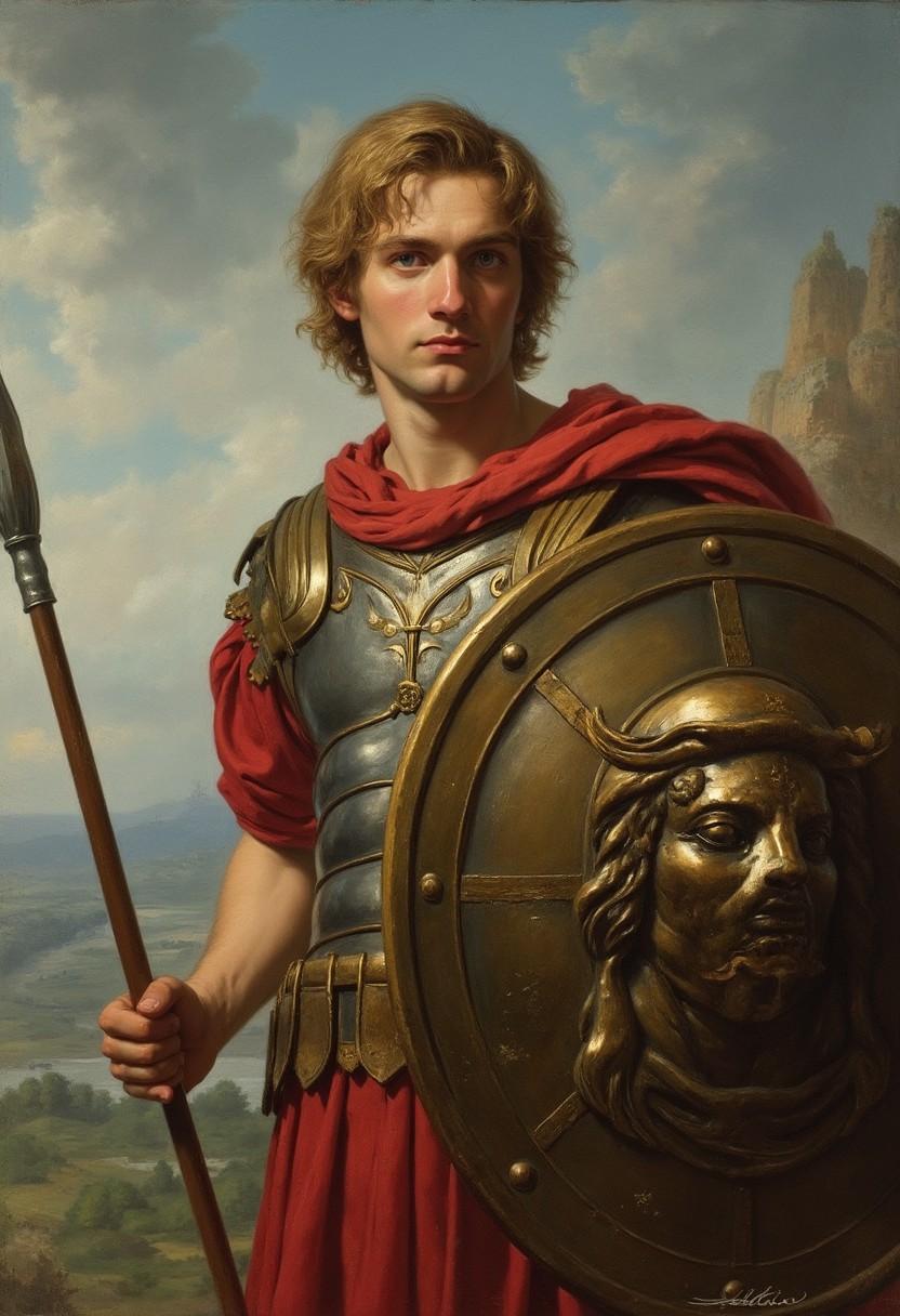 (painting by Theodore Gericault:1.3), alexander the great, full greek armor, blonde hair, shoulder-length wavy hair, holding a spear in right hand, holding a bronze round shield whit medusa head painted on, heroic pose, muscular, details, landscape in background