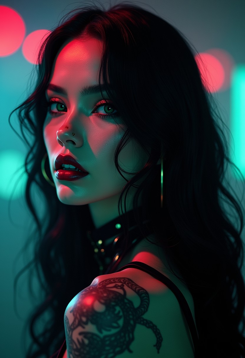(ultra realistic,32k, ultra sharp,masterpiece:1.2),(high detailed skin:1.1),( high quality:1.1),(ultra high res:1.4), (beautiful lighting:1.4), (dynamic angle:1.6), infernal, gothic, spiritual, unusual, elegant, elusive, translucent, exquisite, athletic, reptilian, (professional, intricate details, masterpiece, best quality:1.5), (Thick steel collar:1.7), goth girl, septum piercing, tattoos, green eyes, very long black hair, wavy hair, black mascara, black eyeliner, dark red lipgloss, goth club, dance floor, neon light, lasershow, fog, dark ambiente, (((cat eyes, split eyes))), (porcelain skin)