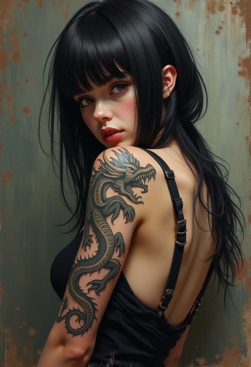 A cinematic painting of Megurine luka with a dragon tattoo on arm