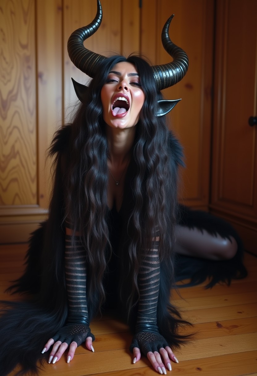 candid color photograph set in a wood paneled room of a stunningly beautiful demon woman on all fours on the ground. She has shiny fur all over her body and huge curled horns. Her fingers have super long curved nails. She has extremely long hair that extends past her feet for a long ways, a thick mass of amazing long long locks, the longest hair ever, meters of hair, longer than their hooves, it trails behind them many meters along the ground. She is panting and drooling with her tongue out. Her eyes are rolled back in pleasure.